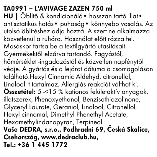 A L’AVIVAGE 2in1 lágyító szer egy KÉT ÖSSZETEVŐBŐL álló antistatikus, puhító és parfümözött szer, amelyet az utolsó öblítéshez adnak a mosógépben vagy kézi mosáskor. A 750 ml-e megfelel 4,5 l hagyományos lágyítónak.