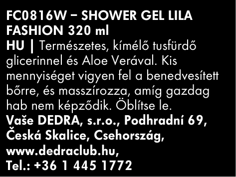 LILA FASHION – luxus zuhanyzselé mandarinnal, eukaliptusszal, jázminnal és gyöngyvirággal, érzéki vanília és tonkabab alapra. Glicerin és Aloe vera a finom, hidratált bőrért. SLS, SLES és parabének nélkül.