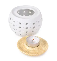 LUCENTA | Kerek aromalámpa csillagos dekorral | matt fehér máz & fa talapzat