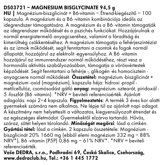 Összetevők: biszglicinát magnézium (magnézium) + magnézium-oxid (magnézium), kapszula burkolat: hidroxipropilmetilcellulóz, csomósodást gátló anyag: magnézium-sztearát, piridoxál-5-foszfát (B6 vitamin).