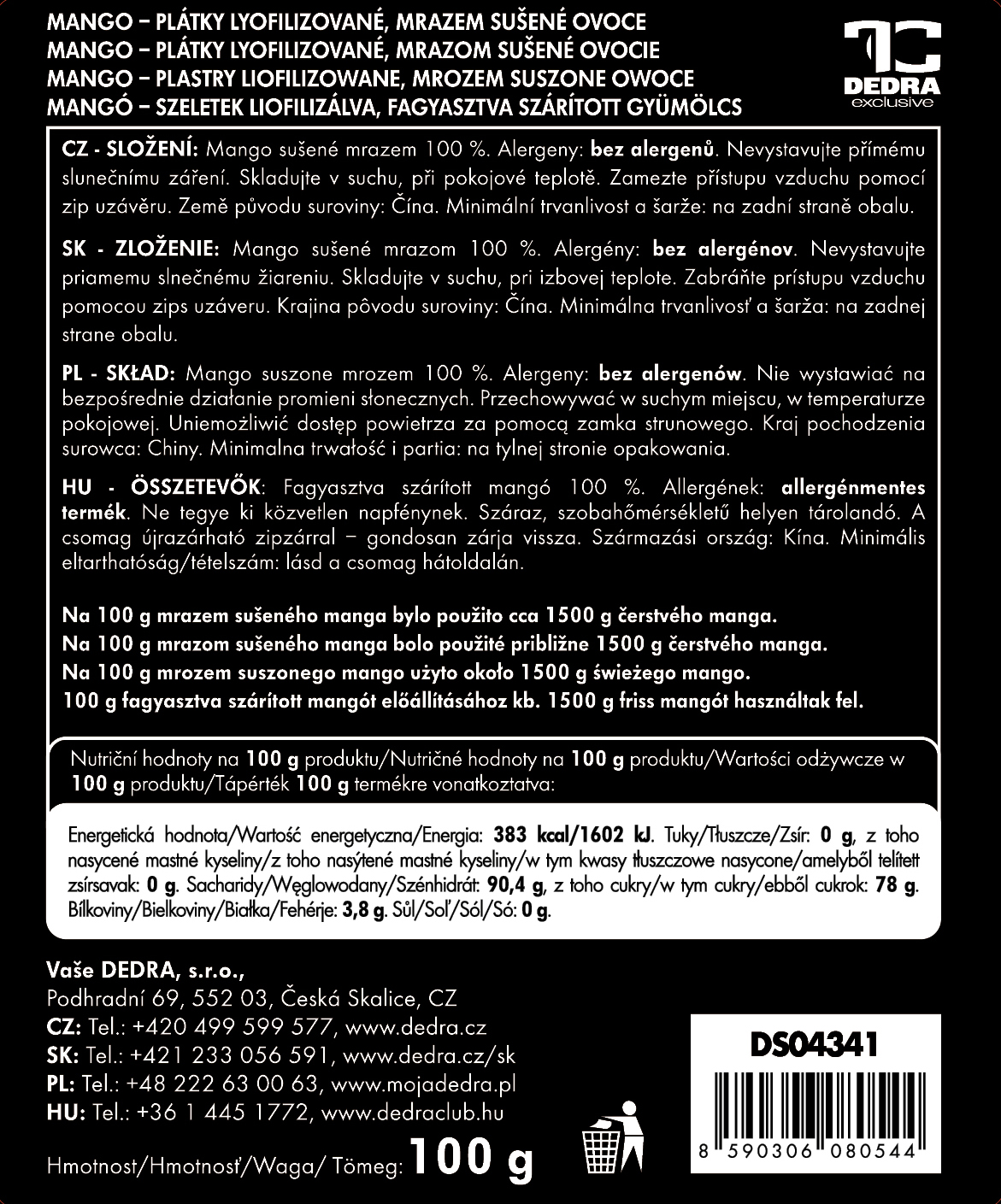 Összetevők: fagyasztva szárított mangó 100 %. Allergen mentes. Ne tedd ki közvetlen napfénynek. Száraz, szobahőmérsékleten tárold. Zárd le légmentesen a zipzárral.