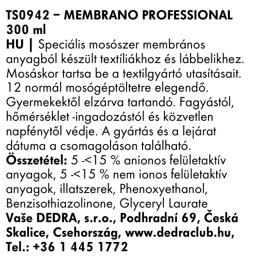 MEMBRANO PROFESSIONAL, 300 ml, speciális mosószer védőmembránnal ellátott anyagokból készült textíliákhoz és lábbelikhez.