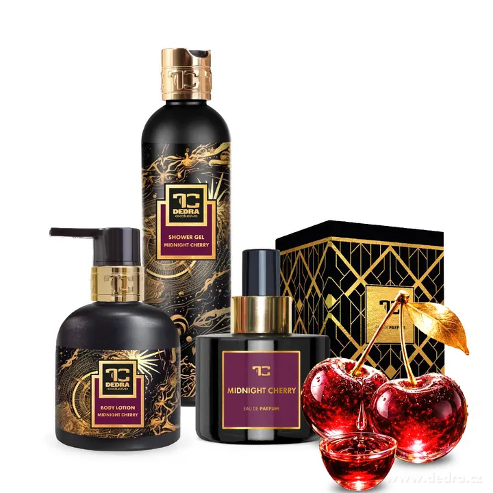 Érzéki ajándékcsomag MIDNIGHT CHERRY 1+2 INGYEN: 100 ml parfüm, 320 ml testápoló és 320 ml tusfürdő. Cseresznye, mandula, ylang-ylang és vanília illata. Luxus gondoskodás a testnek és az érzékeknek.