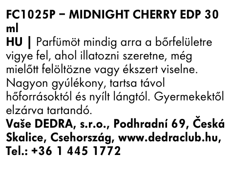 MIDNIGHT CHERRY – érzéki parfüm víz érett cseresznyék, keserű mandulák, cseresznye likőr és vanília illatával. Egy luxus és elbűvölő összetétel, ami elvarázsol és felejthetetlen nyomot hagy.