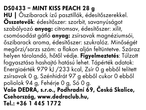 Az eredeti kombinációja a finom mentának és az édes baracknak, amely lágy, mégis hatékony frissességet biztosít a lélegzetnek – cukor nélkül és felesleges kalóriák nélkül. Ideális azok számára, akik szeretik a gyümölcsös tónusokat és a diszkrét ízeket. A kompakt csomagolás elfér a zsebében, táskájában vagy az autó kesztyűtartójában, így mindig kéznél tarthatja.
