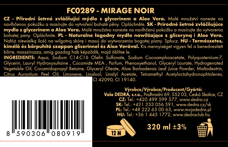 MIRAGE NOIR – luxusos folyékony szappan glicerin és Aloe verával. Finoman tisztít, hidratál és selymesen simává varázsolja a bőrt. SLS, SLES és parabének nélkül. Az érzéki citrus- és levendula illatot mély, fás pacsuli és vetiver akkordok egészítik ki. Űrtartalom: 320 ml.