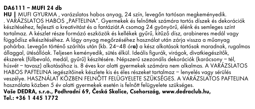 MUFI PAFTELÍNA – habos, formálható anyag, amely a levegőn megszilárdul (24–48 óra). Csomag 24 színben, 70 ml-es mennyiségben. Könnyű, rugalmas, nem toxikus, nem ragad. Alkalmas figurák, dekorációk, ékszerek és labdák készítésére. Színek keverhetők, a felületen festhető, tartós alkotások készíthetők. Kicsiknek és nagyoknak egyaránt.