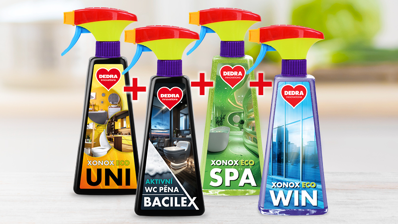 1x univerzális habzó tisztító sima felületekhez XONOX ECO UNI 500 ml + 1x aktív WC hab, WC-tálak, ülőlapok és a toalett körüli területek számára BACILEX 500 ml, 1x fürdőszobai habzó tisztító vízlepergető hatással XONOX ECO SPA 500 ml + INGYEN 1x habzó tisztító ablakokhoz, üvegekhez és tükrökhöz XONOX ECO WIN 500 ml