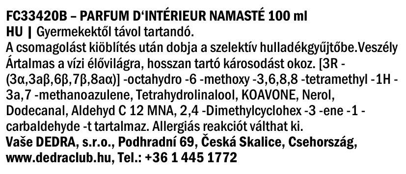 Azonnali hatású lakásparfüm. A hozzáadott víz NÉLKÜL készült összetételének köszönhetően illatával elárasztja otthonodat, az irodádat, a ruhásszekrényt vagy az autódat, mindezt vízcseppek NÉLKÜL. A NAMASTÉ meditációs illata, tele rózsás tónusokkal és citrusos árnyalatokkal. Attraktív csomagolásban, aranyfóliás díszítéssel.