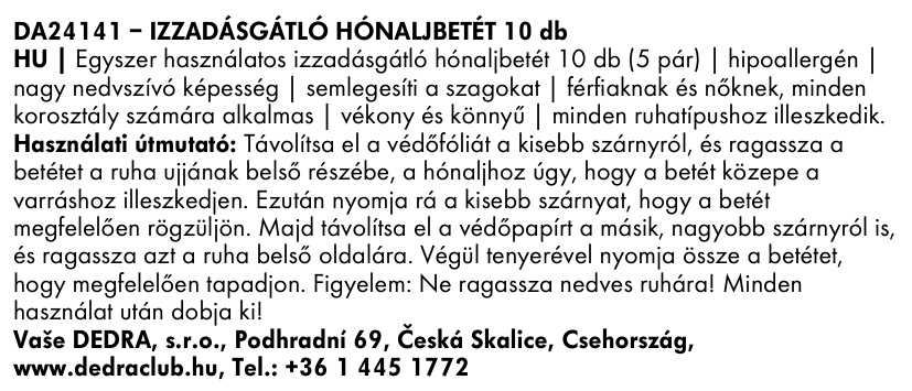 NEPOTÍTKO® – pamut hypoallergén öntapadó betétek izzadás ellen. Magas felszívóképesség, szagsemlegesítés, vékony és diszkrét. Minden típusú ruházathoz alkalmas, férfiak és nők számára egyaránt. Csomagolás 10 db (5 pár).