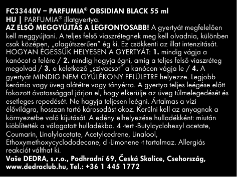 A belső elegancia világának kapuja a mi új luxus parfümünkkel, OBSIDIAN BLACK. Ez a magasan szofisztikált illat lélegzetelállító élményként nyílik meg, ylang-ylang és narancs kombinációjával. A meleg érintés kibővíti a rózsa és a levendula tónusait.