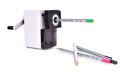 Asztali kézi hegyező ceruzákhoz körülbelül 0,9 cm átmérőig, minőségi acél pengével és nagy „faháncs” tárolóval, tartalmazza a rögzítési anyagot az asztalhoz.