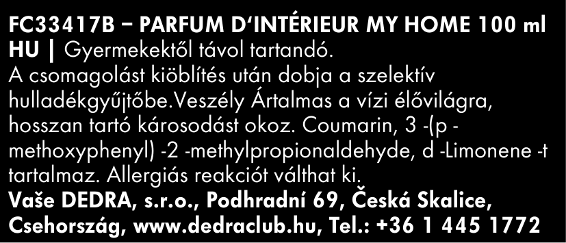 Lakásparfüm azonnali hatással. A HOZZÁADOTT VÍZ NÉLKÜLI összetevőnek köszönhetően otthonodat, irodádat, gardróbodat vagy autódat illatosítja, mindezt CSEPP VÍZ NÉLKÜL. MY HOME Vonzó csomagolásban, aranyozott nyomtatással.