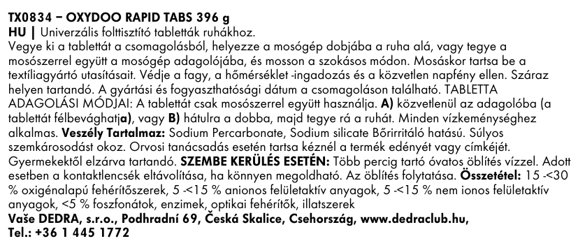 - Speciális formula különböző ruhákhoz: a RAPID TABS OXYDOO kifejezetten különböző ruhákhoz, beleértve a fehér és színes ruhákat is, segít megőrizni a fehérséget és megakadályozni a szövetek szürkülését.