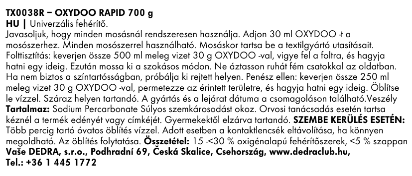 - Az OXYDOO RAPID az a termék, amelynek mindenképpen a háztartási készletek között kell lennie. Kötelező. Add hozzá bármilyen mosószerhez (gélhez, porhoz, tablettához vagy kapszulákhoz). Ezzel fokozhatod a hatását és saját „szuperterméket” készíthetsz kiemelkedő erővel! A szennyeződések vagy foltok a textílián nem rendelkeznek eséllyel. A hatás kiemelkedő és azonnali.