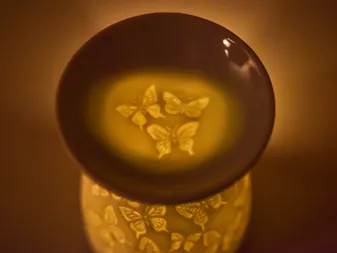 A PAPILLIA kerámia aroma lámpa, amelyen a pillangók dombornyomott motívuma látható, matt fehér mázzal, gyönyörű fényhatásokat vetít, ha meggyújtják benne a gyertyát. Kiválóan alkalmas a PARFUMIA® viaszokhoz és esszenciákhoz. Átmérője 9,5 cm, magassága 12 cm. Romantikus és gyengéd.