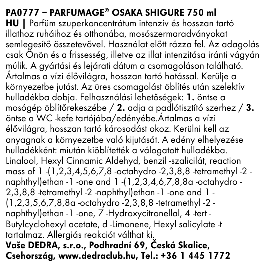 PARFUMAGE® mosodaparfüm az intenzív és hosszan tartó mosodaillatért. Semlegesíti a mosószer-maradványokat, feleleveníti a színeket és kíméletes a borhöz és a mosógéphez. Az utolsó áztatásig a lágyító helyett adjuk hozzá. Minden típusú mosáshoz 95 °C-ig alkalmas.