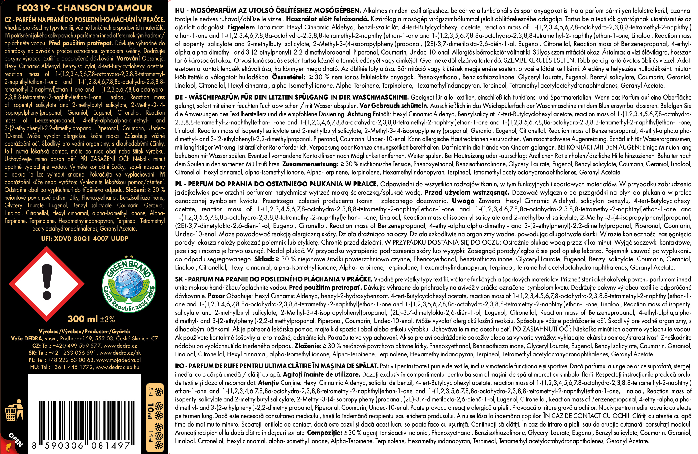 PARFUMAGE® SUPREME CHANSON D´AMOUR – 4× kisebb adag, 4× nagyobb hatás. Csak 5–15 ml elegendő a mosáshoz, és ruhája intenzív és tartós illatot kap. Élénkíti a színeket, semlegesíti a mosószer maradványait, és kíméletes a bőrhöz és a mosógéphez. Kisebb adag – nagyobb hatás, 95 °C-ig alkalmas.