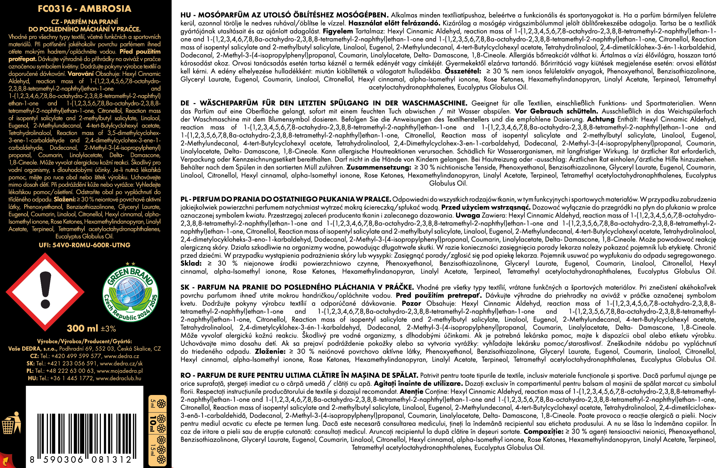 PARFUMAGE® SUPREME AMBROSIA egy 4× koncentrált kozmetikai mosóparfüm, amely helyettesíti az öblítőt vagy az illatgyöngyöket. Intenzív, hosszan tartó illatot ad a ruháknak, élettel tölti meg a színeket, miközben kíméletes a bőrhöz és a mosógéphez.