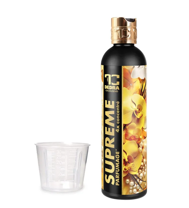 PARFUMAGE® SUPREME FLEUR DE VANILLE egy 4× koncentrált kozmetikai mosóparfüm, amely helyettesíti az öblítőt vagy az illatgyöngyöket. Intenzív és hosszan tartó illatot kölcsönöz a ruháknak, élettel tölti meg a színeket, miközben kíméletes a bőrhöz és a mosógéphez.