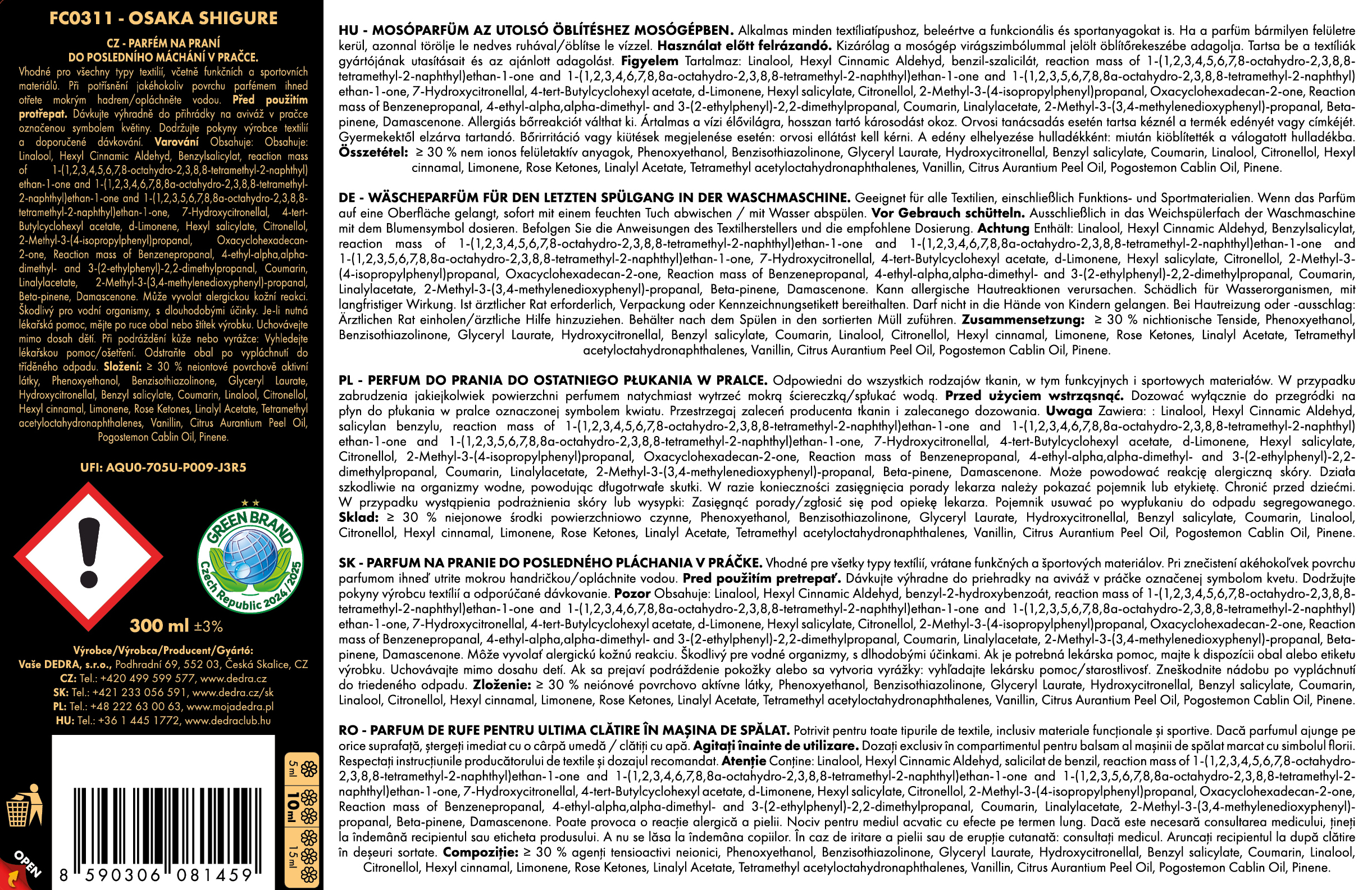A PARFUMAGE® SUPREME OSAKA SHIGURE egy 4× koncentrált kozmetikai parfüm mosáshoz, amely helyettesíti a lágyítót vagy az illatos gyöngyöket. Intenzív és tartós illatot ad a ruháidnak, felfrissíti a színeket, és kíméletes a bőrhöz és a mosógépedhez is.