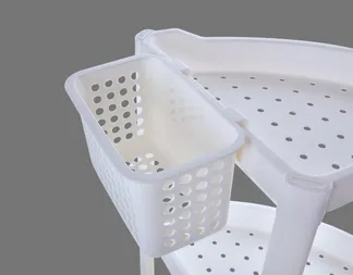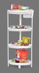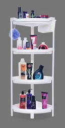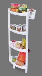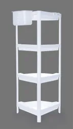 100 cm magas sarkos, 4 szintes polc perforált polcokkal, akasztós kosárral és kampókkal. Praktikus tároló a fürdőszobába, konyhába vagy gyerekszobába, higiéniai termékek, élelmiszerek és játékok számára.