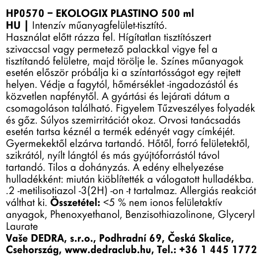 A PLASTINO ECOLOGIX 500 ml egy hatékony habos tisztító műanyag felületekhez új EKO összetétellel, amely még az ellenálló szennyeződésekkel is elbánik. Műanyag bútorok, ablakkeretek vagy kerti bútorok – mindezt a PLASTINO segítségével tökéletes tisztaságra és magas fényre varázsolhatod. Ráadásul védőfóliát képez, amely megakadályozza az újbóli szennyeződést és lepergeti a vízcseppeket.