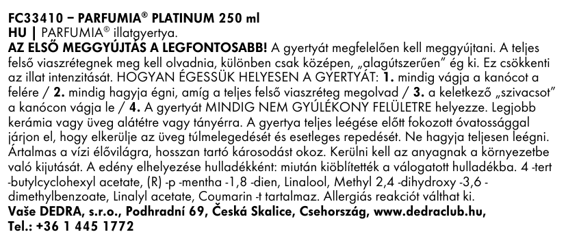 KÉZI KÉSZÍTÉS! Minden gyertyát kézzel készítünk nálunk Cseh Skalica-ban, és tartalmaz egy minőségi prémium parfümöt. Vonzó csomagolásban kerül forgalomba, újrahasznosított kartonból készült friss férfias fás parfüm, PLATINUM.