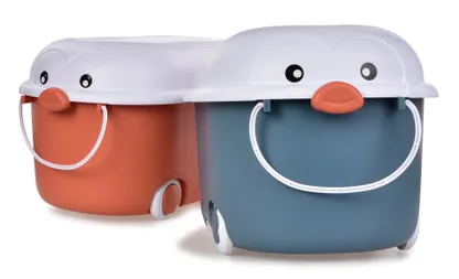 Görgős gyermek doboz fedéllel, fogantyúval és 4 kerékkel a könnyű mozgatás érdekében. Strapabíró műanyagból készült.
