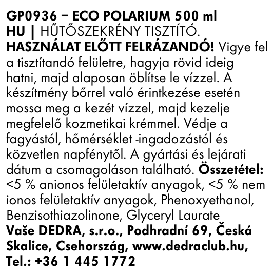Az öko tisztító és leolvasztó POLARIUM hűtőszekrények, fagyasztók, vitrinek és egyéb hűtőberendezések karbantartására készült. Innovatív összetétele révén hatékonyan tisztít, felolvassa a jeget és fényes felületet hagy maga után.