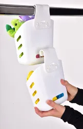 A PRAKTIK univerzális szervező fehér színben, akasztóval. Méretei: 15,5 × 13 × 10,5–17 cm, tartós műanyag szellőző nyílásokkal. A moduláris rendszer lehetővé teszi több darab egymásra helyezését. Ideális fürdőszobába, konyhába és öltözőbe.