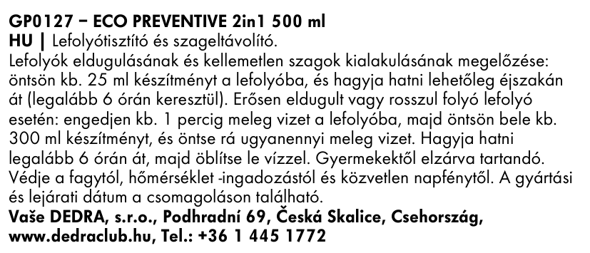 PREVENTIVE BIO 500 ml természetes bioaktív lefolyó tisztító enzimatikus összetevőkkel, amely megelőző hatású a dugulások ellen, és hatékonyan semlegesíti a kellemetlen szagokat.