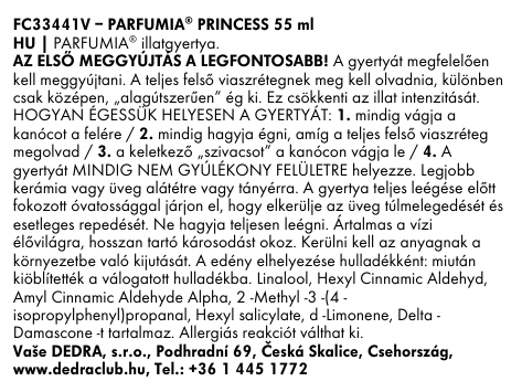 A parfüm inspirozva a královským élet és az összetétele révén el tud vinni a fantázia és az álmok birodalmába. Lépjen be az PRINCESS illat varázslatos világába, amely felkavarja az érzékeit elbűvölő bájával. Gyümölcsös és virágos tónusok harmonikus és friss illatot alkotnak. A ibolya egy meleg és vonzó érintést hoz. A gyöngyvirág és jázmin egy titokzatos utalással csatlakozik, amely felébreszti a kíváncsiságát és emlékek karjában öleli magát romantikus estékről.