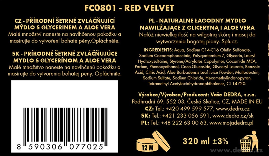Luxus csomag RED VELVET 1+2 INGYEN: parfümvíz 100 ml, finom szappan 320 ml és tusfürdő 320 ml. Keleti virágos illat sáfránnal, jázminnal és borostyánnal a különleges pillanatokra.