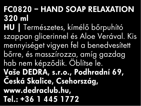 RELAXATION – természetes folyékony szappan glicerin és Aloe vera tartalommal a bőr gyengéd tisztítására és hidratálására. SLS, SLES és parabének nélkül. Nyugtatja, regenerálja és selymessé, rugalmassá teszi a bőrt. Csomagolás 320 ml.