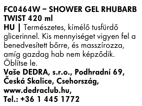 RHUBARB TWIST – természetes tusfürdő glicerinnel a bőr kíméletes tisztításához és hidratálásához. SLS, SLES és parabének nélkül. A bőrt simává, rugalmassá teszi, és megvédi a kiszáradástól. Csomagolás 420 ml.