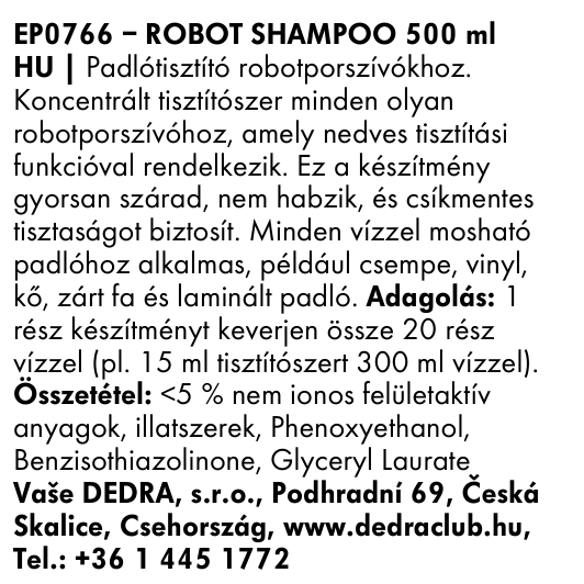 Adagolás: keverjen 1 rész ROBOT SHAMPOO-t 20 rész vízbe (pl. 15 ml tisztítószert keverjen össze 300 ml vízzel). Az elkészített oldatot öntse a robotporszívó víztartályába mop funkcióval. Tartsa be a használati utasításokat és az oldat alkalmazására vonatkozó útmutatásokat a porszívójához.