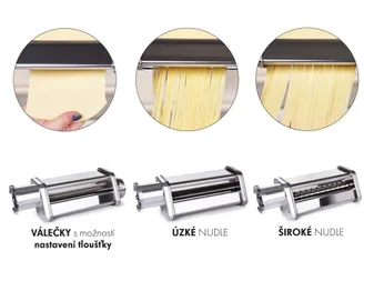 2+1 INGYEN tésztakészítő, 3 kiegészítő a házi tészták készítéséhez (széles tészta, keskeny tészta, lapok a vastagságuk beállításának lehetőségével). Anyag: kiváló minőségű rozsdamentes acél.