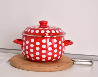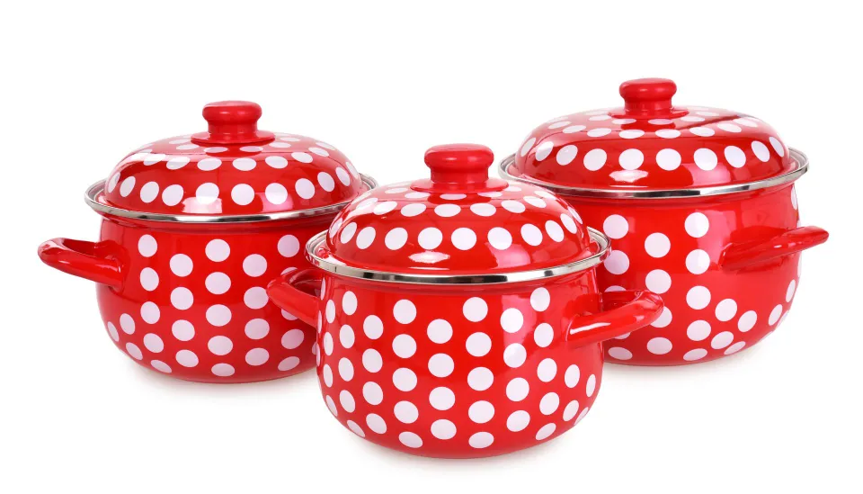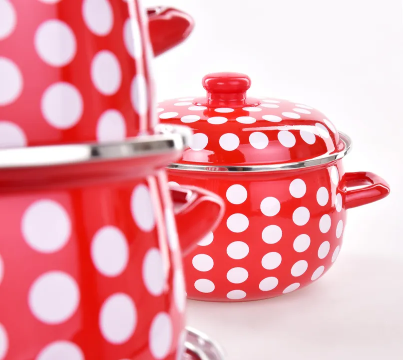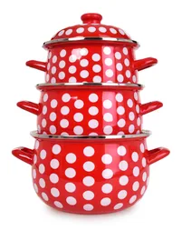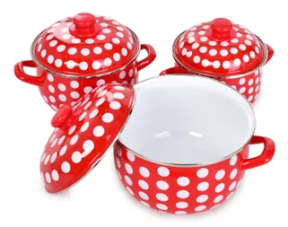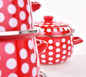 Retro smaltált edények RUSTICAL piros színben, fehér pöttyökkel, 6 darabból álló készletben. Vastag falúak, tartósak, minden főzési felületen használhatók, beleértve az indukciót is, valamint mosogatógépben moshatók. A fedél nélküli sütőben is használhatóak.