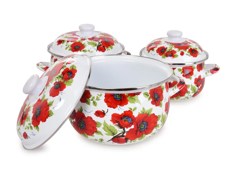 Hagyományos, mákvirág mintás RUSTICAL zománcozott lábas készlet 6 részes kivitelben. Vastag falú, ellenálló, minden főzőfelületen használható, indukciós tűzhelyekhez is, mosogatógépben és fedő nélkül a sütőben is alkalmas.