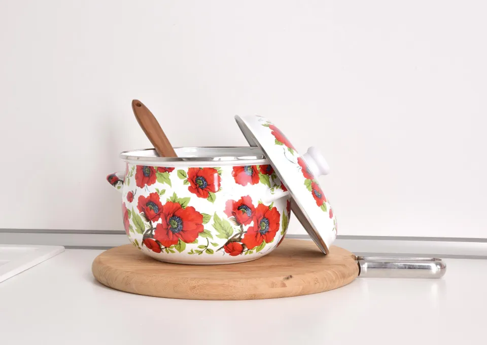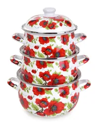 A gyönyörű virágmintás hagyományos zománcozott lábasok modern kivitelben térnek vissza. RUSTICAL kínálatában 6 részes vastag falú zománcozott lábas készlet mákvirág mintával található, amely nosztalgikus megjelenését ötvözi a tartóssággal és praktikussággal.
