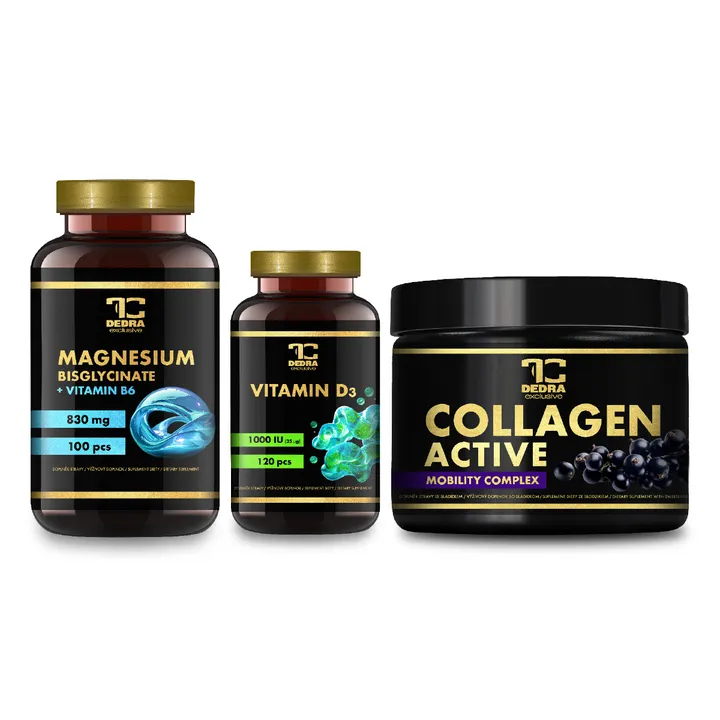 KOSTI & SVALY készlet magnéziummal, D3-vitaminnal és kollagénnel. Értelemmel összeállított kombináció, amely a normál izomműködésre, az egészséges csontok és ízületek fenntartására, valamint a fáradtság és kimerültség csökkentésére összpontosít. Alkalamazható a mindennapi hosszú távú kiegészítéshez.