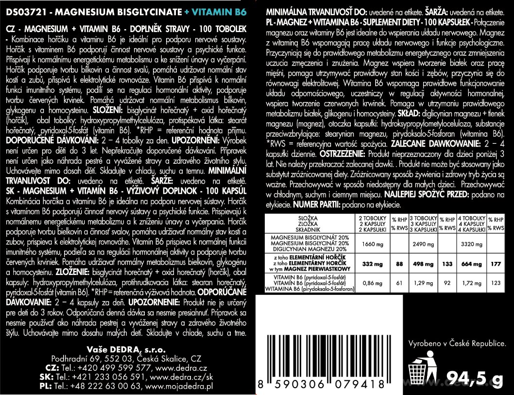 - 1x MAGNESIUM BISGLYCINÁT 830 mg (166 mg elemi magnézium) + B6-vitamin P5P, maximális felszívódás, izmok, csontok, idegek & energia, 100 kapszula