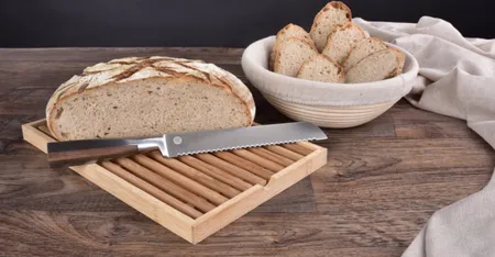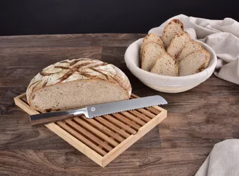 SAKAI PROFESSIONAL BAKER egy csúcsminőségű kés kenyér és péksütemény vágásához, amely megfelel a professzionális szakácsok és a nehezen kielégíthető otthoni péksütők elvárásainak. A penge speciális, kiváló minőségű 3Cr13 rozsdamentes acélból készült, amely híres tartós élességéről és tökéletes kiegyensúlyozottságáról. A fűrészfogú élnek köszönhetően képes mindenféle péksüteményt kezelni – a ropogós bagettől kezdve a légies pirítóson át – anélkül, hogy összenyomná vagy megszakítaná a bélét.