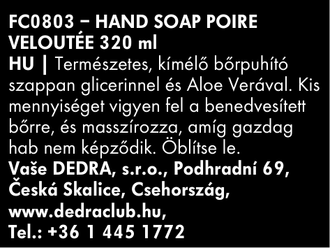 SAMETOVÁ HRUŠKA – luxusos folyékony szappan glicerin és Aloe vera tartalommal. Finoman tisztít, hidratál és selymessé varázsolja a bőrt. SLS, SLES és parabének nélkül. Az exkluzív kollekció része, különleges illatokkal. Csomagolás 320 ml.