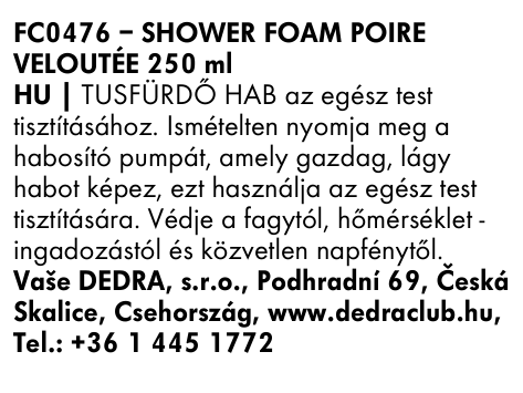 SAMETOVÁ HRUŠKA egy exkluzív kollekcióból származó tusfürdő hab, amely a mindennapi fürdést egy luxussal teli élménnyé emeli. A pumpáló gomb megnyomásával gazdag, finom hab keletkezik, ami simán eloszlik, gyengéden tisztítja a bőrt és hidratálja azt. Az Aloe vera Barbadensis és glicerin révén a bőr puha, nyugodt marad, védett a kiszáradástól.