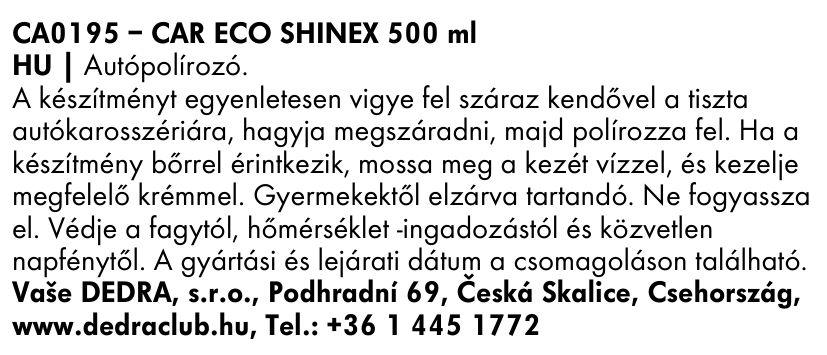 EKO fényesítő SHINEX szilikonolajokkal a maximális fényesség és a fényezés védelme érdekében. Ideális a karosszéria fényezésére és a szennyeződésekkel szembeni ellenállás növelésére. Űrtartalma 500 ml.