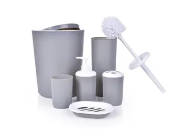 SPA fürdőszobai kiegészítő szett 6 részből álló szürke-fehér kombinációban. Tartalmaz egy poharat, fogkefetartót, szappanadagolót, szappantartót, szemetes vödröt és WC kefe. Elegáns, praktikus és modern fürdőszoba felszerelés.