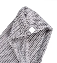 A praktikus patentos záródás biztosítja, hogy a turbán szorosan a fejen maradjon, még mozgás közben is. A semleges szürke szín minden fürdőszobába illik, visszafogott és stílusos megjelenést kölcsönöz.