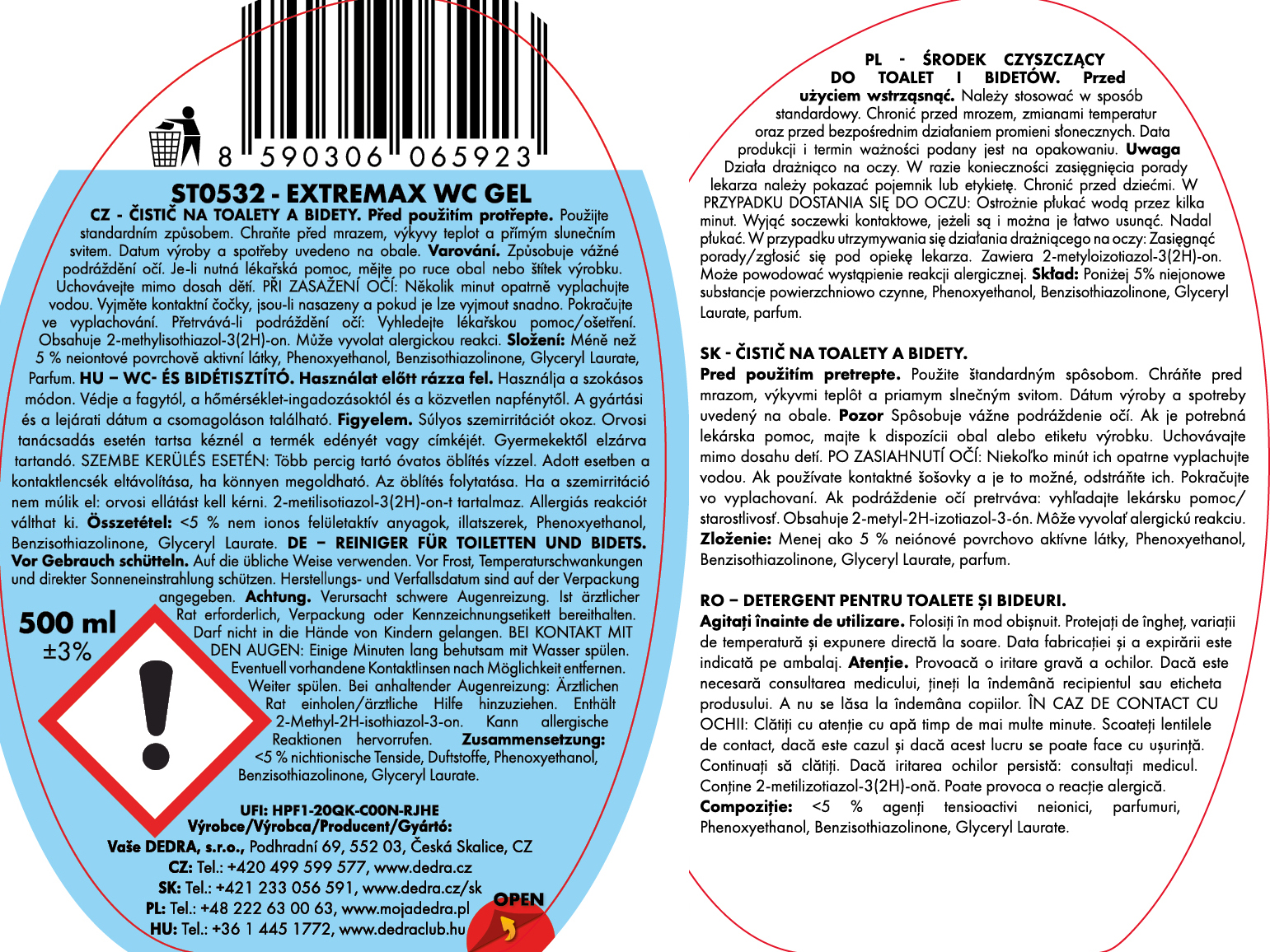 Az EXTREMAX WC GEL az erő, a hatékonyság és a fenntarthatóság kombinációja. Még az erősen szennyezett felületeket is megtisztítja, friss illatot és higiéniai biztonságérzetet hagy maga után. Ráadásul új összetételének köszönhetően környezetbarát és a csatornahálózatra sem káros.